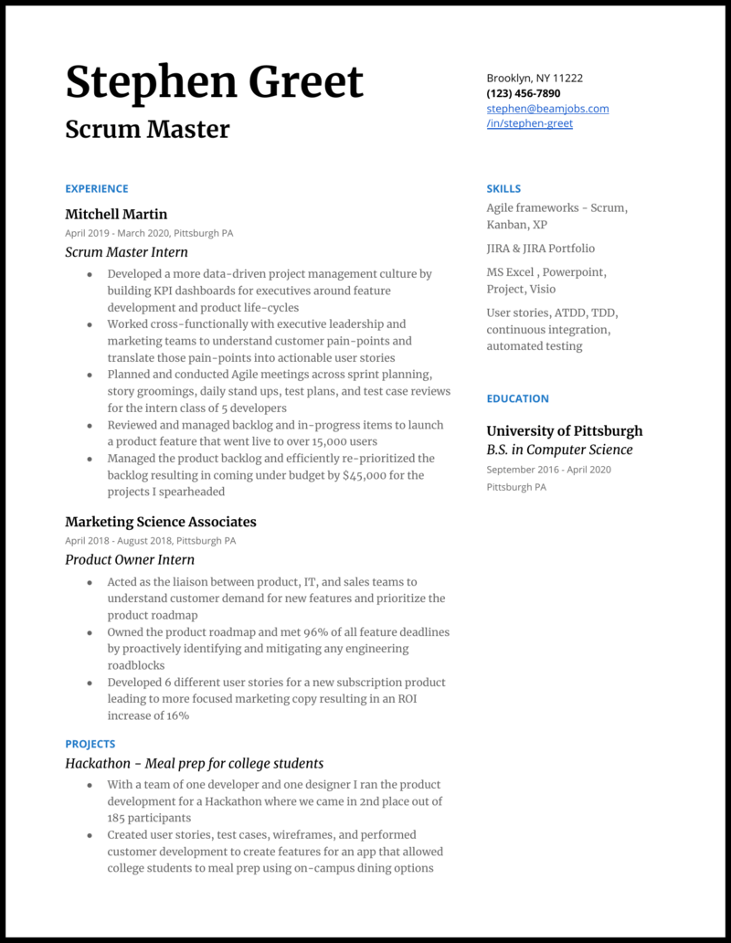 Jan 28, 2021 · 5 scrum master resume samples for 2021.. These resume templates have been designed to help you land an interview in 2021 no matter what stage of your scrum master career you're at. Add links to kaggle, github or a personal website if you have a professional account.. Add links to kaggle, github or a personal website if you have a professional account.
